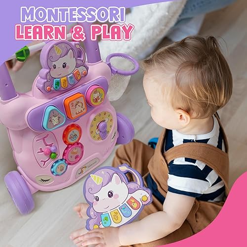2-in-1 Growing Design: Sit, Play & Walk:Starts as a fun activity center for sitting babies (6-12 months), then converts to a stable push walker for toddlers (12-18+ months). Choose from 4 cute themes: Frog, Spider, Unicorn, or Bunny.
