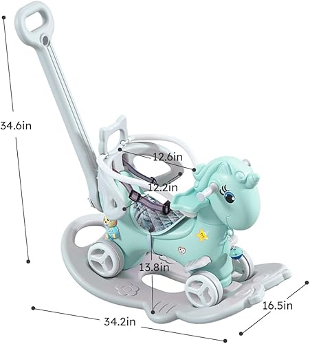 4-in-1 Multifunctional Toddler Play ModesEasily switch between rocking horse, ride-on toy (with push handle), 4-wheel balance bike, and balance board. Suitable for indoor & outdoor use, with a rotatable horse head for extra fun.