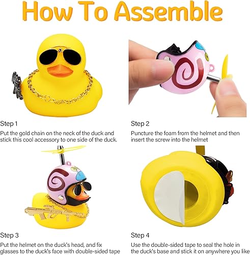 [DIY DUCK] - Need to assemble, all duck accessories are detachable, so we match them according to our preference. The package includes 3pcs gold chains, 3pcs different helmets, 3pcs sunglasses, 3pcs double-sided tapes, and 3 ducks.
