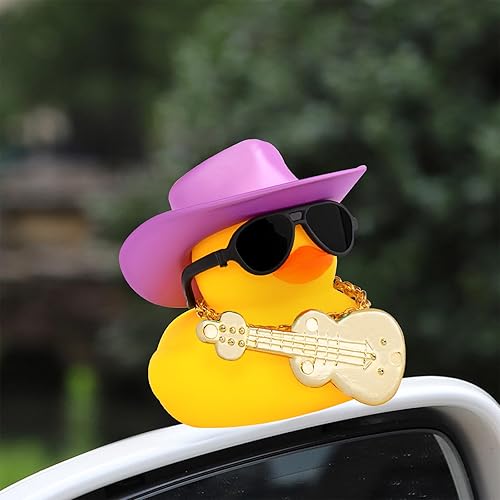 Package Content: Comes with 1pc rubber duck with a mini cowboy hat, sunglasses, necklace, mini guitar decoration, and double-sided tapes.
