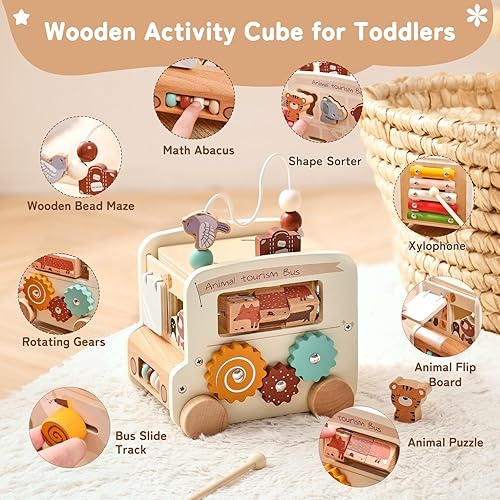 8-in-1 Interactive Fun : The Wooden Activity Cube combines 8 engaging activities including gear rotation, animal puzzles, baby xylophone, bead maze, shape sorter, track slide, abacus, and board acence, making it a versatile multipurpose educational toy for toddlers