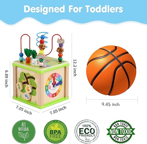 8 in 1 Wooden Activity Cube:Our wooden activity cube offers 8 different ways to play, including a bead maze, rotating gears, a learning clock, a puzzle maze, an abacus, carrot harvest, and word cards with a flip top. With so many options, children will stay engaged and excited to play with this toy