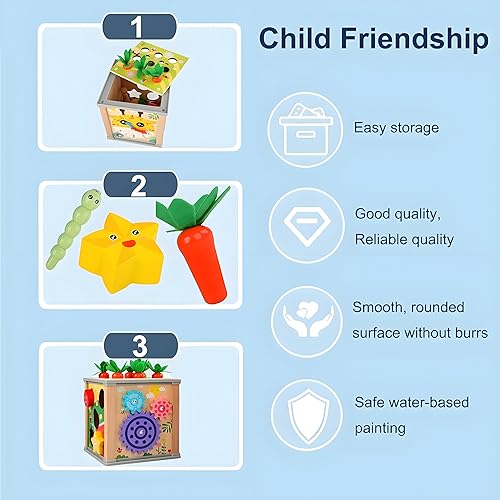 Multifunctional Educational Enlightenment Toy for Toddler: Six ways to play in one activity cube featuring shape sorting, carrot harvesting, magnetic worm catching, xylophone music, rotating gears, and a giraffe clock for endless entertainment