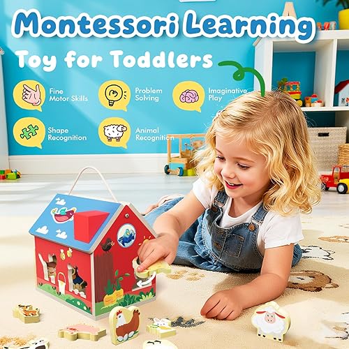 【Montessori-Inspired STEM Learning Fun】Designed as a farm animal shape sorter, this barn playset encourages color recognition, shape matching, counting, and animal sound imitation. It helps develop fine motor skills, hand-eye coordination, and problem-solving abilities while supporting early STEM learning—perfect educational toys for toddlers 24-36 months and preschoolers up to 4 years old.