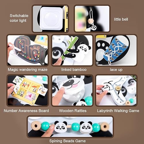 [9 in 1 Large Wooden Busy Board] This wooden busy board has 9 different types of activities including colored lights, bells, gear, walking game, bead maze game, bamboo linkage, digital flip, castanets, Panda bead flip game, etc. A variety of interactive little organs to keep kids busy and enjoy exploring. It is a very practical children's toy to exercise small life skills and cultivate logical thinking