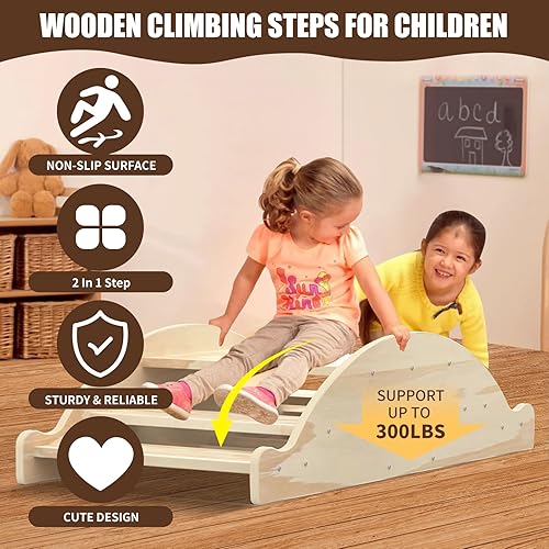 [HIGH-QUALITY WOOD ROCKER BOAT & STAIR CLIMBER]: Our wooden boat stair climber is crafted from solid pine wood, with a sturdy 25mm thickness to ensure long-lasting quality. The boat&steps can support up to 300 LBs and features a clear lacquer finish with smooth, rounded edges for added safety.