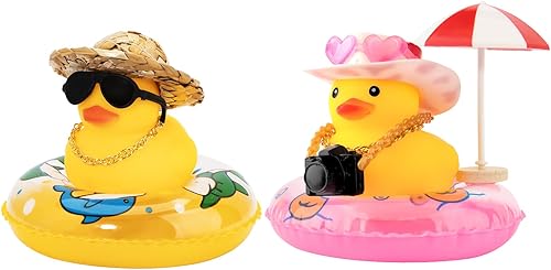 2Pcs Funny Duck Car Decorations: These car ducks are equiped with straw/sun hat, swim ring, necklace, sun umbrella,sunglasses and double-sided tape, a unique and adorable duck to decorate our car.