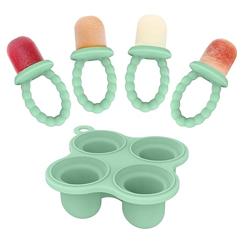 Ginbear Silicone Baby Fruit Food Feeder & Freezer Tray (Set of 2), Infant Teething Feeder Pacifiers with Baby Popsicle Molds Combo 4 Months+ (Hazy Green/Almond)