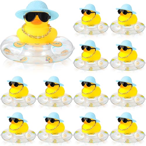 Sotiff Mini Rubber Ducks Bulk for Kids Children Cute Yellow Duck Toy for Dashboard of Car Ornaments with Sunglasses Swim Ring Mini Hat Necklace for Birthday Party Gift(12 Sets,Cute)
