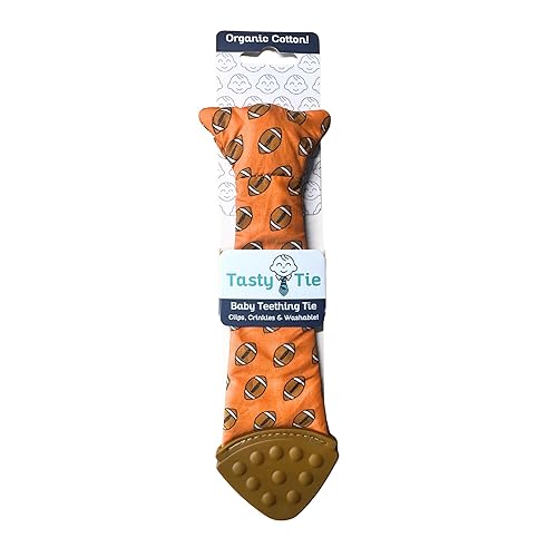 Tasty Tie Teething Tie, 3-in-1 Clip-on Baby Tie Crinkle Toy & Silicone Teether for 3-6-9-12-18 Month Babies | GOTS Certified Organic Cotton | Unique Baby Boy Gift or Stocking Stuffer, Football Style