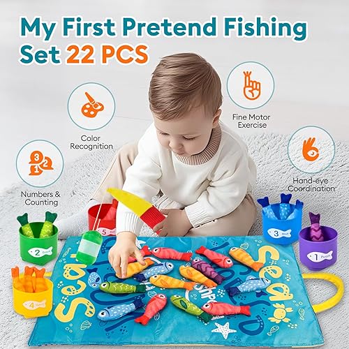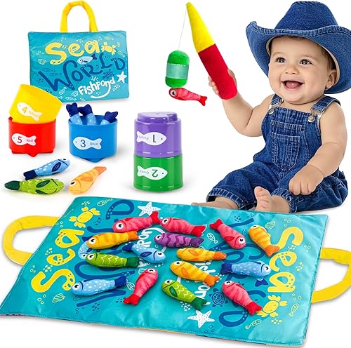 Toddler Montessori Sensory Toys for 1 Year Old - Baby Boy Girl Toys 1 Years Old Birthday Gift, Cloth Fishing Game with Stacking Cups,Number Counting and Color Sorting