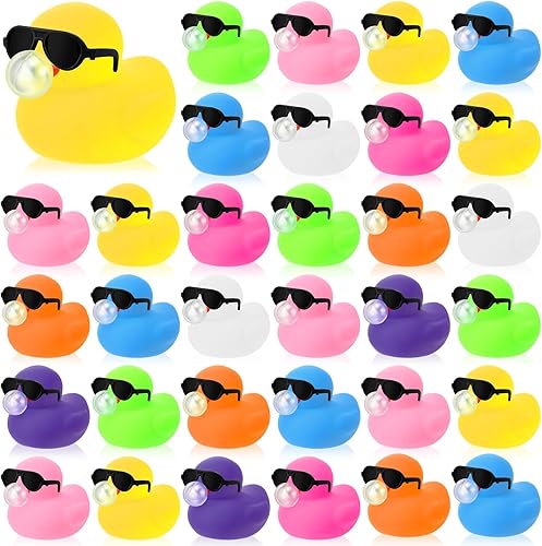 HyDren 24 Pcs Mini Bubble Rubber Ducks with Sunglasses Set Squeeze Bubble Toy Bulk 2 Inch Rubber Duckies Bath Toy Squeaky Float Bath Pool Toys for Kids Birthday Party Favors Supplies Prize Rewards