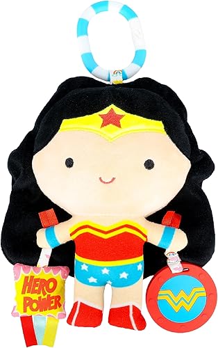 KIDS PREFERRED DC Comics Wonder Woman Multi Sensory Activity Toy with Teethers, Crinkle Textures, and Clip for On The Go Fun for Infant and Baby Boys and Girls Medium