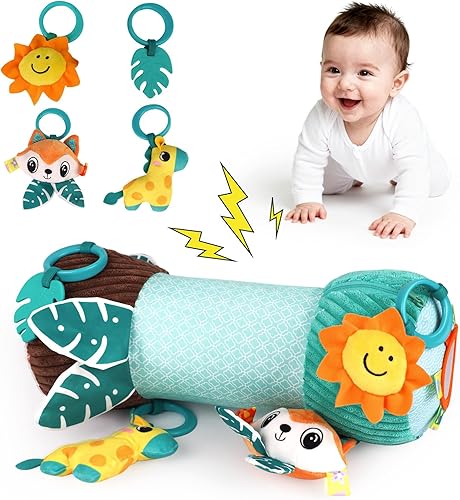 Inflatable Baby Tummy Time Toys Pillow for Newborn, Montessori Baby Sensory Toys Roller with Detachable Mirror, Squeaker, Teether & Rattle, Help with Early Development 3-6 Months (Fox)