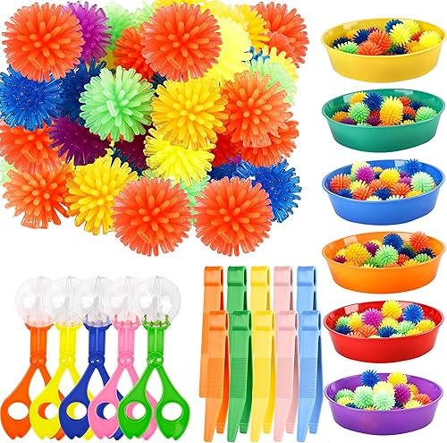 141 Pieces Fine Motor Toy Counting Sorting Sensory Bin Filler Include 6 Colorful Sorting Cup 10 Tweezers 5 Bear Ball Clip 120 Hedge Balls for Kid Early Skill Education