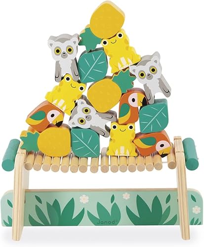 Janod - Tropik Tropical Balance Game - Wooden Toy - 1 Bridge to Construct and 15 Stackable Pieces - Educational Toy: Fine Motor Skills - Water-Based Paint - 2 Years + J08271
