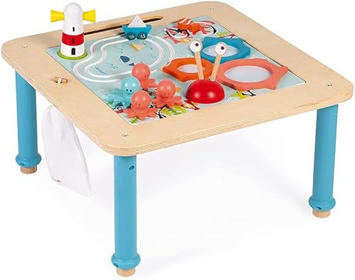 Janod - J08041 - Evolutionary Wooden Activity Table - 5 Early Activities - Magnetic Drawing Tray - with Hanging Storage Bag - from 18 Months