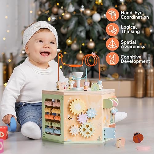 ROBUD Wooden Activity Cube, 13-in-1 Montessori Toys for 1+ Year Old, Educational Learning Toys for Toddlers Age, Fountain Garden Theme for Baby Boys & Girls