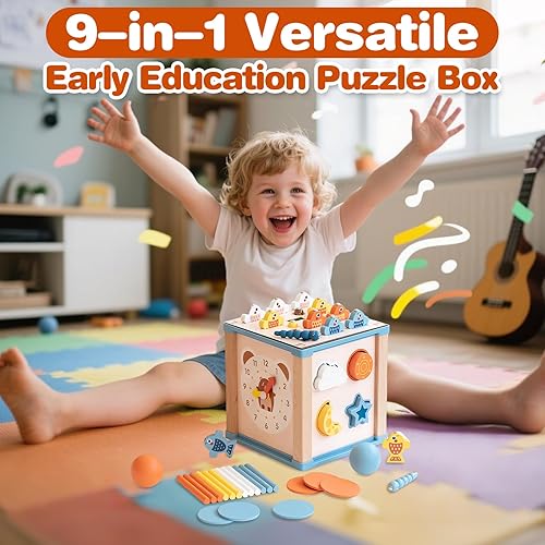 Wooden Activity Cube, 9-in-1 Montessori Toys, Year Old with Fishing Game, Educational Learning Toys, Educational Toddler Activities for 1 2 3 Year Old Christmas Birthday Gifts
