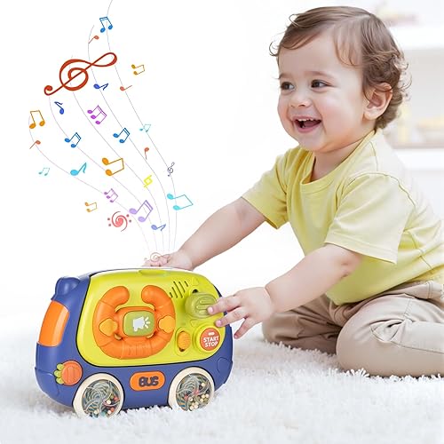 3 in 1 Montessori Bus Toys for Toddlers 1-3 Year Old, Light Up Musical Baby Toys, Road Trip Busy Board for Travel, Sensory Toys with 2 Bell Wheels, Birthday Gift for Infants Boys Girls