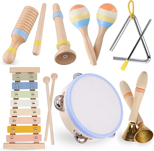 Montessori Wooden Musical Instruments for Toddlers 1-3, Baby Music Toy Set with Xylophone, Tambourine, Triangle, Clarinet, Maracas, Natural Sensory Educational Toys for Boys and Girls