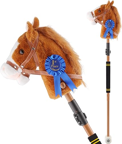 Stick horse, Hobby horse on a stick for kids ages 4-12 adjustable 30-52" with Illuminated Silent Wheels Comfortable sponge wrapped complimentary AA batteries realistic horse neighs. (brown-blue)