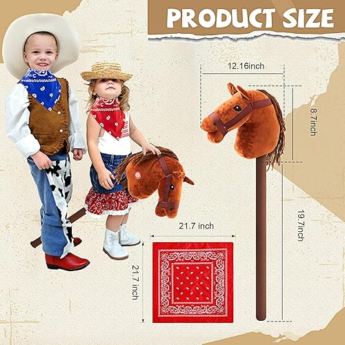 Poen 8 Pcs Light Brown Horse Stick with Sound Red and Blue Bandana Set 27.6'' Toys Stick Horse Western Cowboy Bandana Horse Head Stick with Neighing Sound for Boys Girls Fun Pretend Games