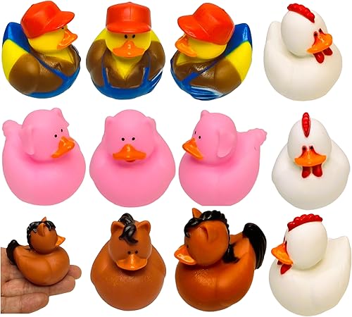 Around The Farm Rubber Ducks (12 Pack) Farmer, Chicken, Pig, Horse Figure Duckies, Bath Tub Toys and Duck Ducking