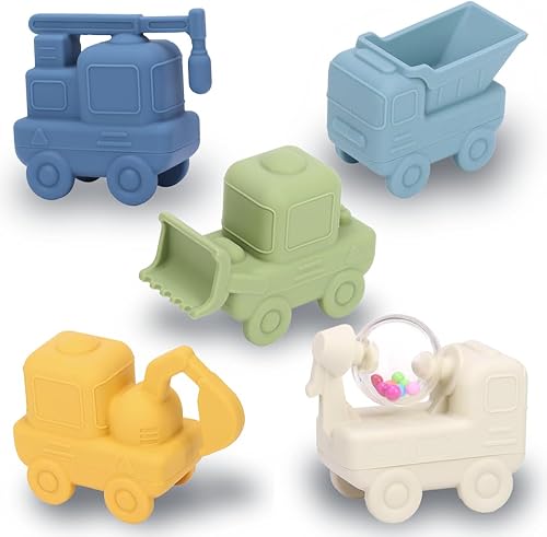 5 Pack Bath Toys with Construction Trucks Silicone Bath Toy Cars Easy-Grip Soft Squeeze Float on Water Fun Baby & Toddler Pool Bathtub Beach Toys Shower Gifts for 6-12 12-18 Months 1 2 3 Year Old
