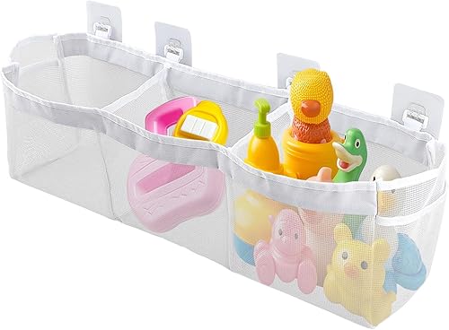 JIANWEI Bath Toy Organizer, 3 Compartment Bathtub Toy Storage Bag, Quick Access Bath Toy Holder with 4 Hooks, Mesh Shower Caddy Practical Supplies for Toy Organizer and Sorting(White)