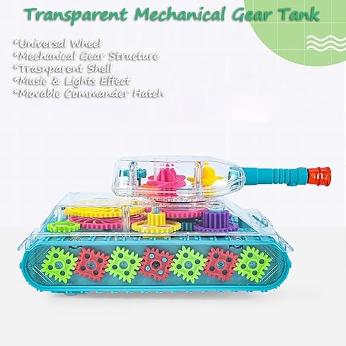 Miracland Transparent Gear Tank Toy for Kids, Light-up Tank Toy Bump and Go Car Toy 3D Gears Toy Military Model Toy for Babies with Lights and Music, Commander Hatch Can Move