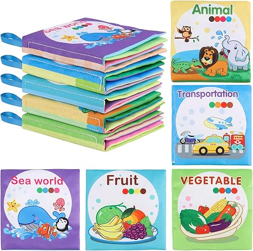 5PCS Baby Bath Books for Toddlers Learning The Names of Animals, Fruits, Vegetables, Transportation, Colorful Patterns, Non-Toxic, Waterproof, Soft Fabric, Preschool Toys for Baby Infant Toddler Kids