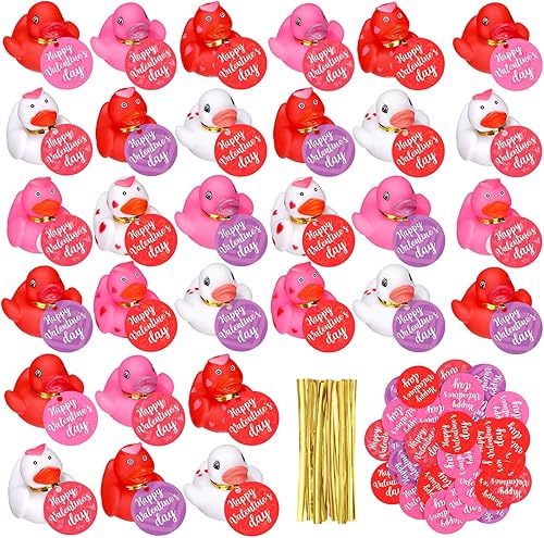 48 Set Valentine's Day Rubber Duckies with Gift Cards Valentines Mini Rubber Duck Bath Gift for Girl Boy Heart Duck Bathtub Pool Gift Classroom Exchange Prize Gift Valentines Party Favor