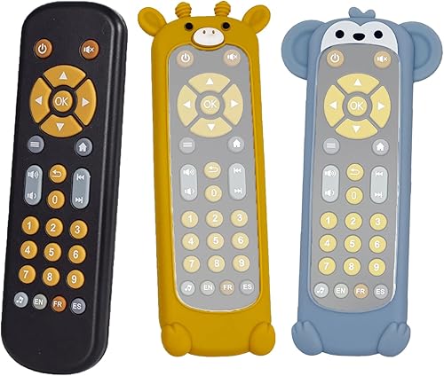 Baby TV Remote Control Toy with Silicone Teether Cover, Toddler Early Educational Music Toys in 3 Languages English/French/Spanish for Infant Boys Girls 6 12 18 Months (Black+Cover*2)