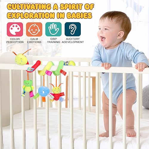 Spiral Car Seat Activity Toy, Stroller Arch Toy, Baby Crib Toys Hanging for Infant Boy Girl Ages 0-12 Months, Newborn Sensory Toy with Rattle, Squeaky, Ringing Bell for Bassinet, Stroller, Crib