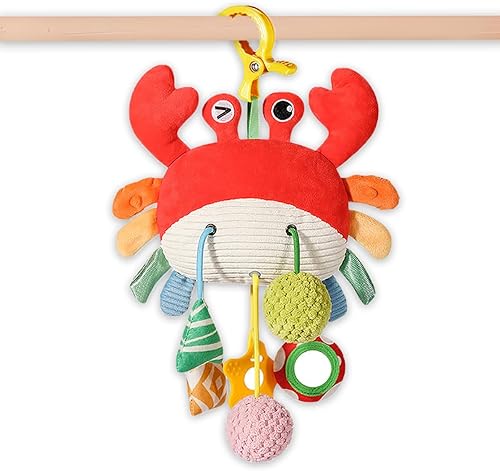 Crab Car Seat & Stroller Toy for Babies 0-12 Months, Sensory Hanging Toy with Rattle, Mirror, Squeaker, BPA-Free Pull Strings, Fine Motor Skills Baby Gift for Newborn Infant Boy Girl