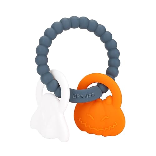 Silicone Teething Ring Toy, Halloween Baby Teether Toys with Rattles Pumpkin and Ghost, Sensory Chew Toys for Babies 3-6-12 Months to Soothe Sore Gums,Dark Grey