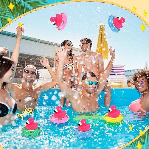 Sotiff 6 Set Flamingo Party Favors Pink Flamingo Rubber Ducks with Swim Ring and Double Sided Tape Cute Floating Squeaky Mini Rubber Ducks for Shower Party Cake Decoration Car Ornament Gifts