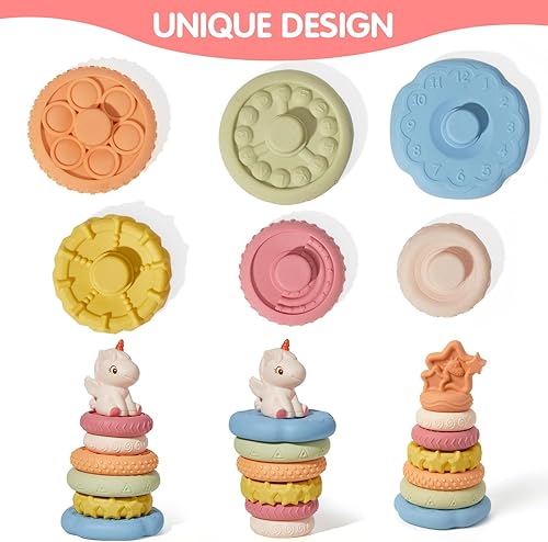 8 Piece Stacking & Nesting Baby Toys, No Hole Stacks of Circles Soft Teething Toy and Building Circle with Pink Horse Figure, Newborn Essentials for 6 12 18 Months Boys Girls