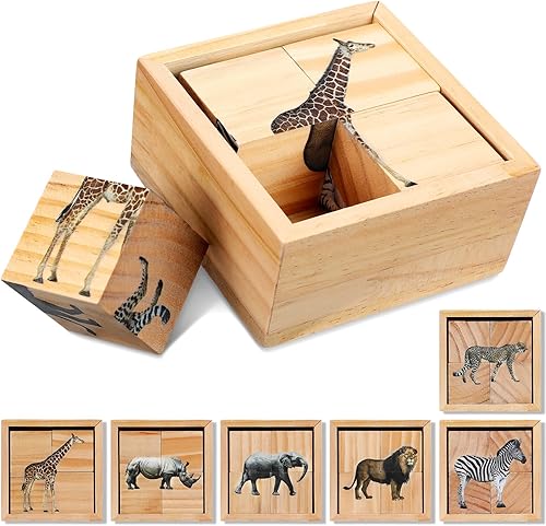 Soulchen 5 Pcs Wooden Animal Chunky Cube Puzzles Set for Toddlers 4 Montessori 6 Puzzles in 1 Safari Animal Chunky Block with Storage Box Learning Educational Toys for Kids Baby Boys Girls Gifts