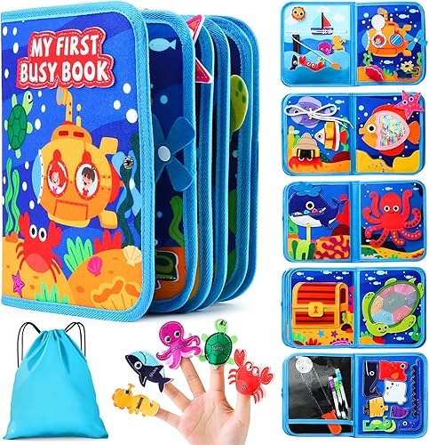 Montessori Busy Book for Toddlers 1-3,Sensory Activity Board with Fishing Game & Finger Puppets,Fine Motor Skills Toys for 1 2 3 Year Old Boys Girls,Educational Travel Learning Gift