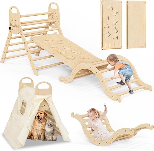 Sehloran Large Size 8 in 1 Pikler Triangle Set with Pinball Game and Tent for Kids, Foldable Toddler Climbing Toys Indoor, Natural Wooden Montessori Climbing Set Jungle Gym with Arch&Ramp&Ladder