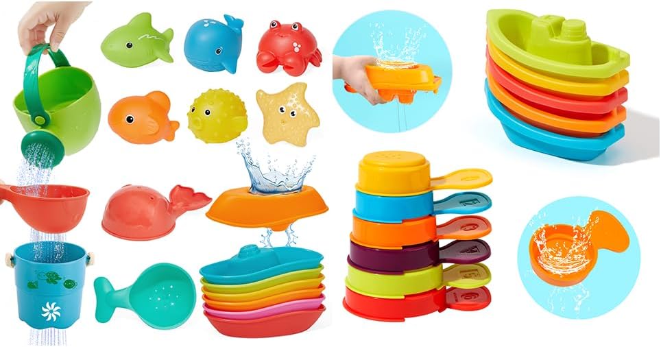 Product 2: 16PCS Bath Toys Set include 1 water bucket, 1 watering can, 2 whale-shaped bath spoons, 6 floating boats, 6 no hole bath toys. To help parents store this kids bath toys, we have eqiupped an adsorbable drying mesh bag