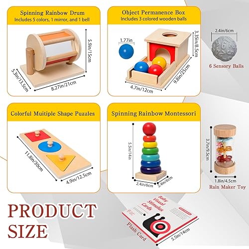 Engaging Montessori Toys for Babies 6-12 Months: This wooden baby toys set includes 12 sensory toys: ,an object permanence box with a ball, a spinning rainbow drum, a spinning rainbow montessori, a colorful multiple shape puzzles toys,a rain maker toy,a flash card set and 6 sensory balls. These toys support your baby’s sensory development and encourage exploration and play