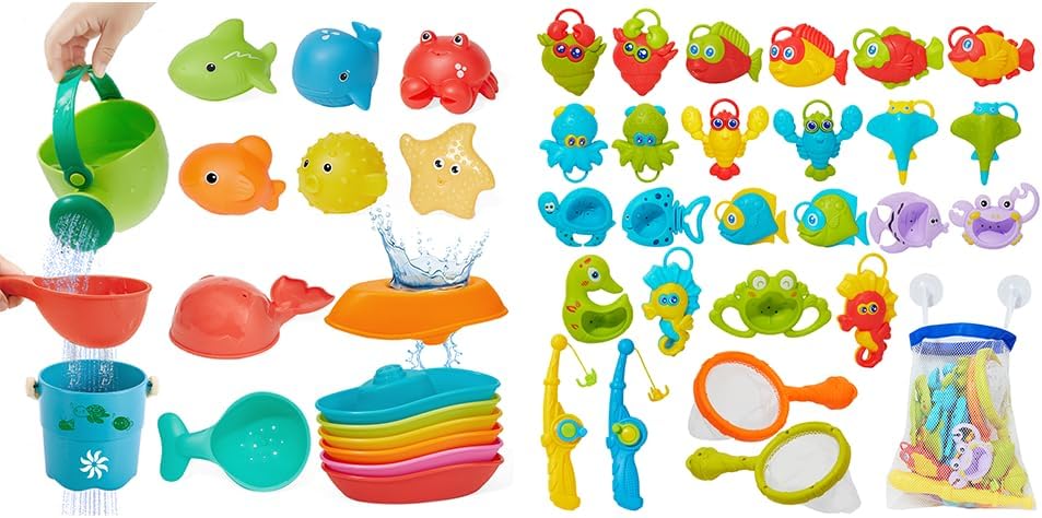 Product 1: : Boat and no hole toys can float on the water, kids can slide the bathtub boat and do fun activities with bath spoons like scooping and pouring water. No hole animal toys can be easily scooped up with a spoon and put into the bucket, experiencing the fun of simulated fishing. The bucket can leak water and has cute patterns at the bottom and the kettle can scoop water to rinse the baby's body