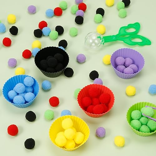 Improve Fine Motor Skills: Kids will improve their fine motor skills and hand-eye coordination by using tweezers or scooper scissors to place pompoms in sorting bowls. Exercise their finger flexibility to improve their hands-on abilities