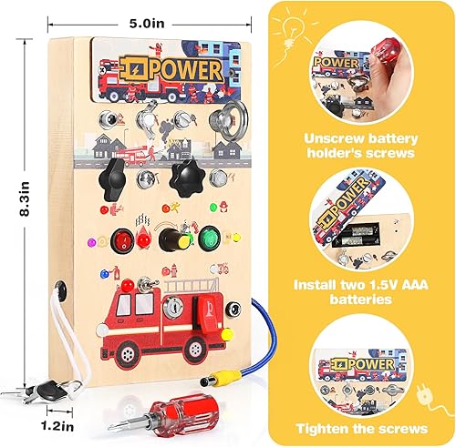 【Fire Truck Theme】: Our product integrates the functionalities of similar busy board & busy book for toddlers 1-3, creating a montessori busy board that is more suitable for kids. Revolutionizing with a fire truck-themed busy board, buttons emit horn sounds, and the fire truck section has 3 lights activated by toggle switches, plugs, and keys. More than just a wooden busy board, it helps teach practical life skills like using switches and keys. With diverse controls and rich lighting effects, this baby busy board enhances a baby's fine motor skills.