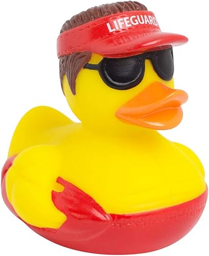 Whimsical Design: This 3-inch yellow colored rubber duck features red hat and trunks with wistle.