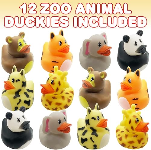 PACK OF 12: Make bath time and playtime extra fun with this set of 12 zoo animal rubber duckies for bath and pool adventures. Each pack includes adorable tiger, cheetah, panda, giraffe, monkey, and elephant designs (2 of each). These cute floating ducks are perfect for toddlers and kids, making every splashy moment more exciting with their vibrant animal-themed designs.