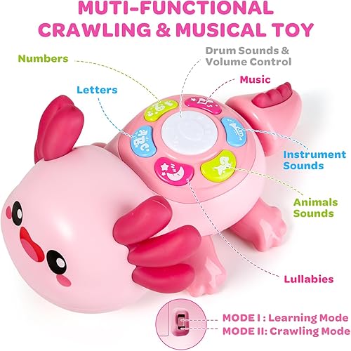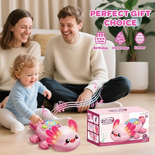 Perfect Gift for Infants & Toddlers: Ideal for 6 7 8 9 10 11 12 months sit-to-crawl babies boys and girls.This musical axolotl toy will be a hit with babies, bringing joy, laughter and endless entertainment to every child's playtime! Your little one will love and use this crawling learning toy every day! Perfect holiday, birthday, New Year, Christmas gift for boys and girls 6-12 month